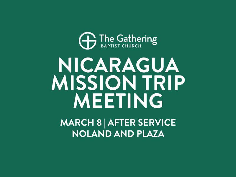 Interested in missions? Join us on Sunday, March 8, directly following the service, for an informational meeting about our Nicaragua mission trip. Learn the vision, dates, costs, and how you can be involved in what God is doing through this upcoming opportunity to serve and share Christ internationally.